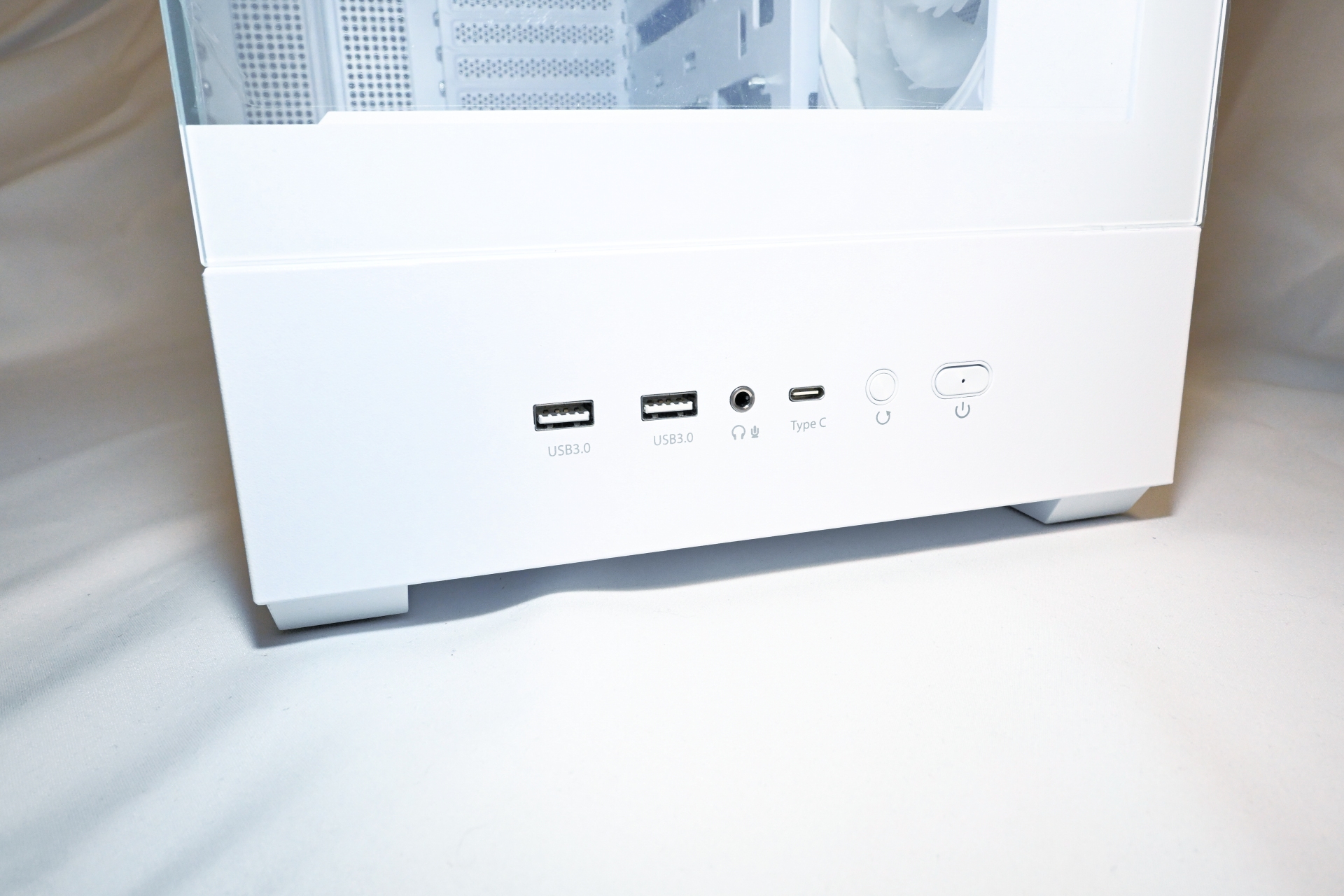 The front of the case offers a selection of ports, with two USB A 3.0 ports, a TRRS jack for headphone and microphone, a USB C 3.2 port as well as a reset and power switch.