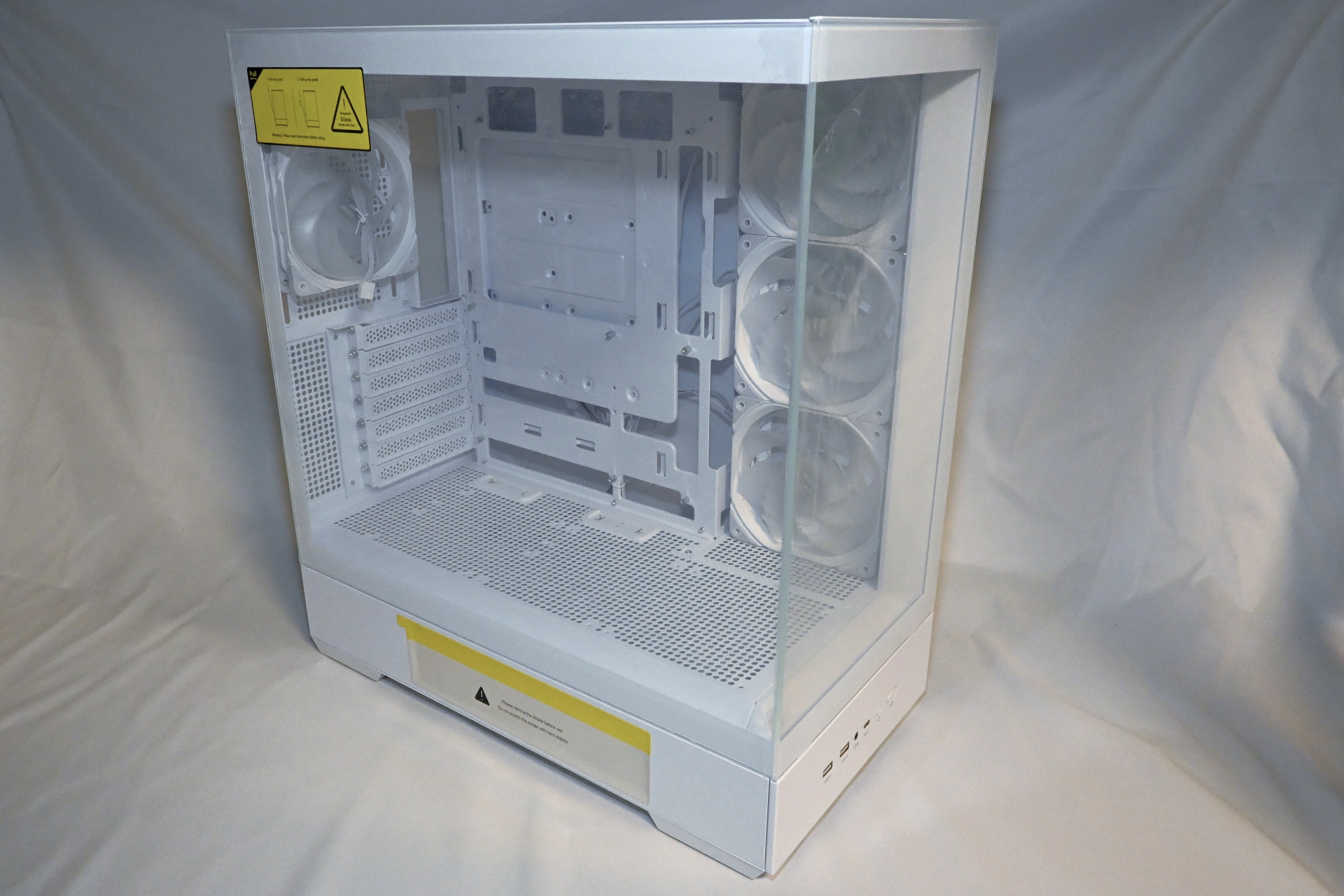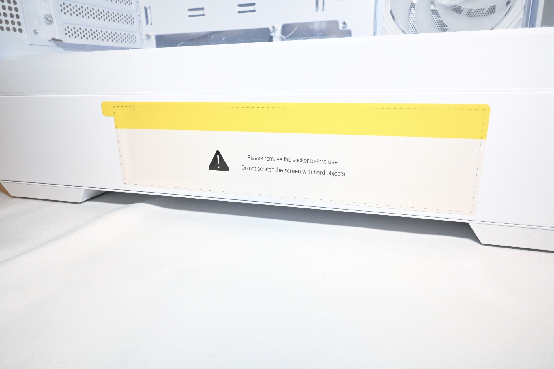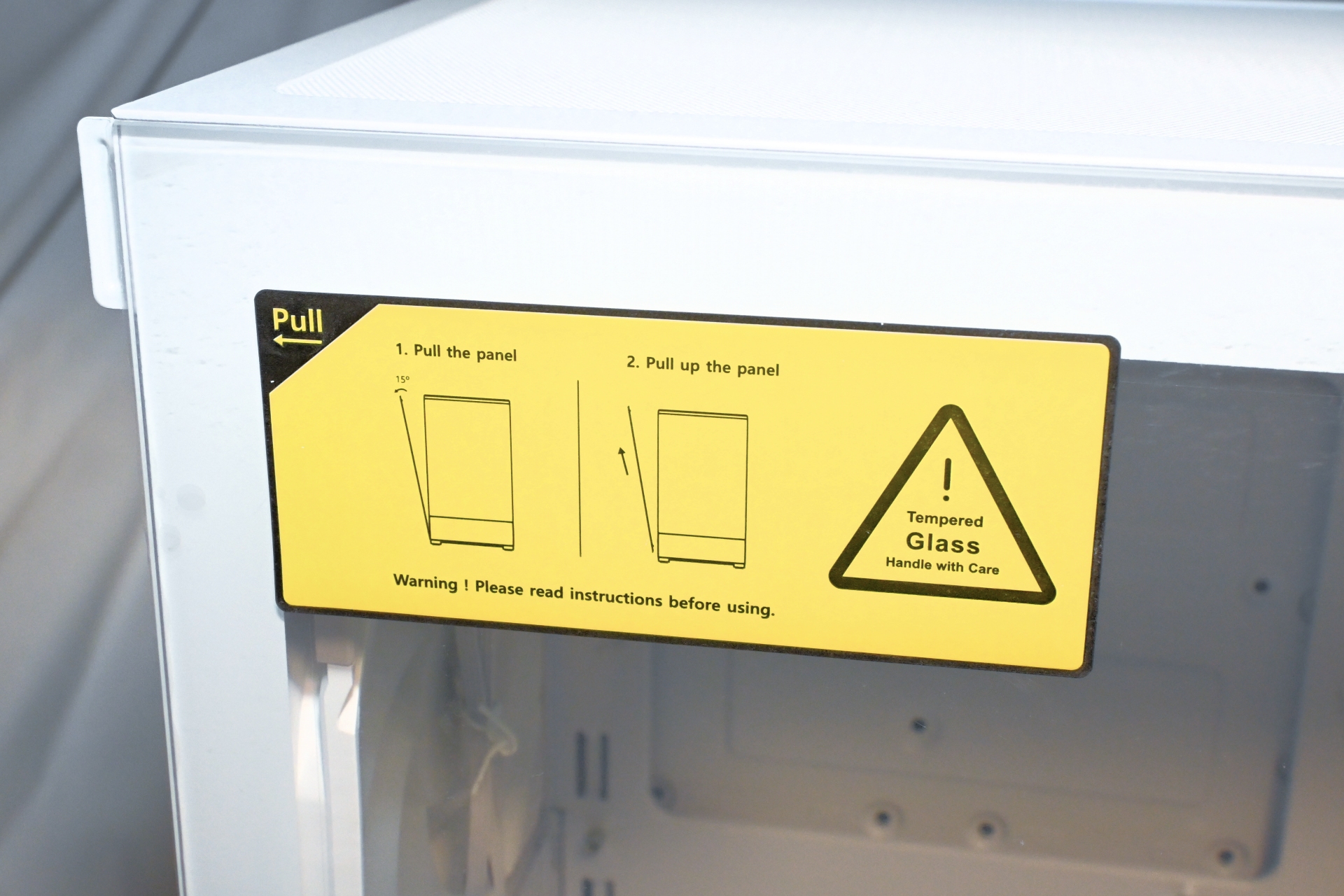 The P40 DS comes well packaged in its own brown cardboard box. Unpacking the box reveals the case in all white with two very large and thick tempered glass panes, one on the left side and one in the front. Both glass panels are further protected with scratch resistant plastic film, which on the side panel also has a sticker showing how to open up the side panel by using the pull tab and pull the panel out about 15 degrees to then be able to lift the side panel out.