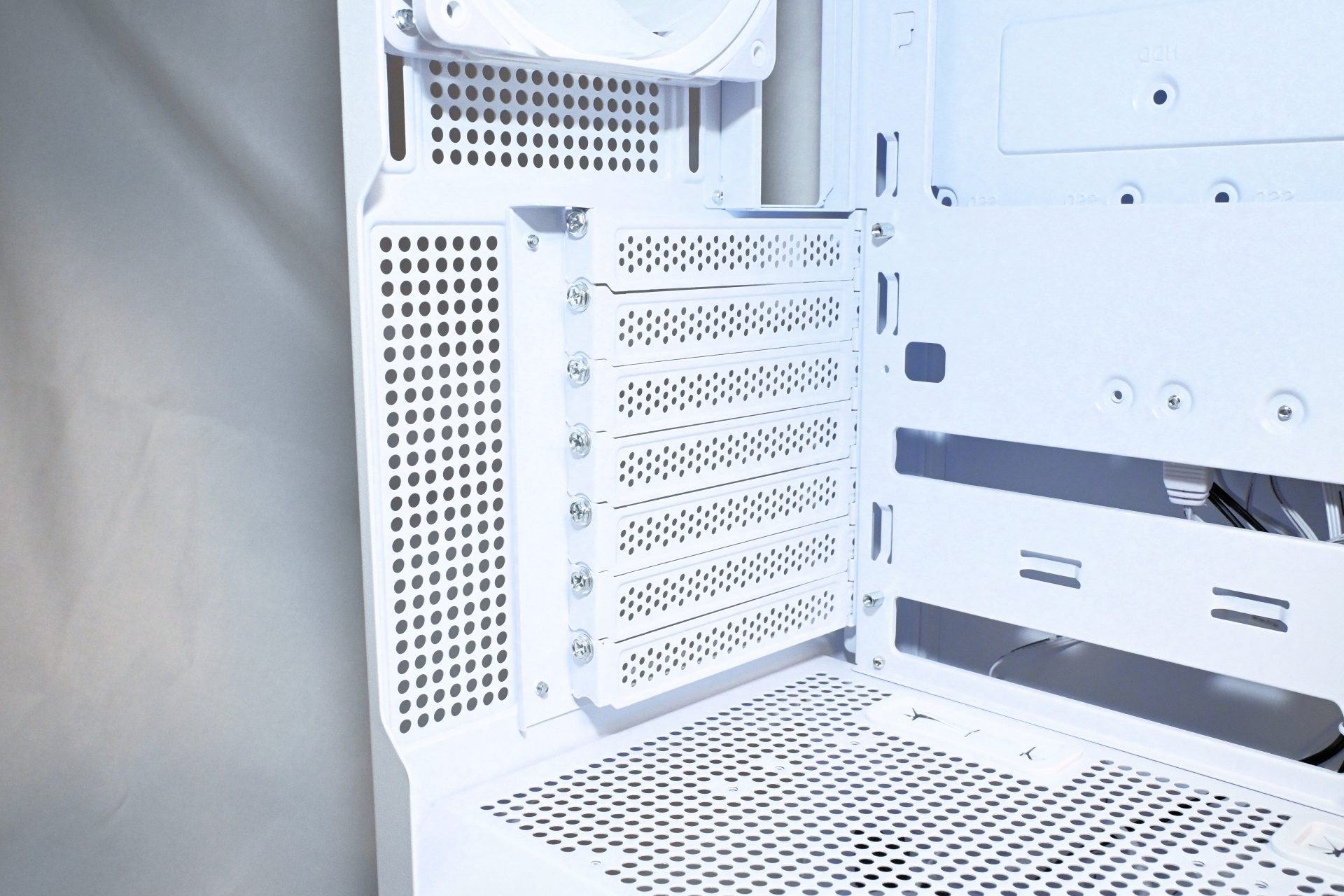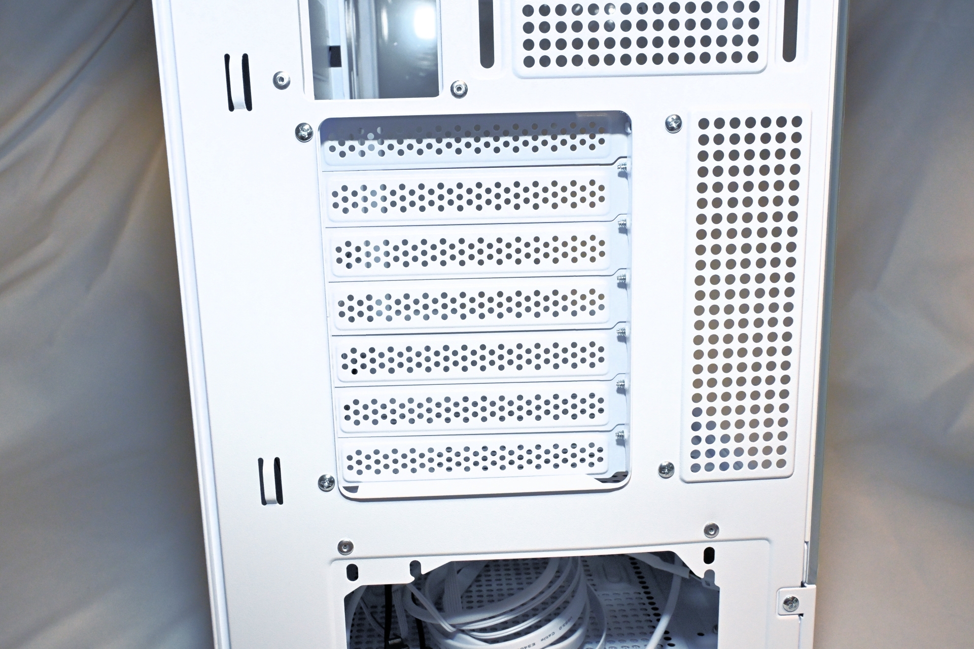 Turning the case around to have a look at the back, we find the power supply mounting place right in the bottom. Above that, not so surprisingly we find the expansion slots - of which we have a total of seven. The expansion slots can be loosened and rotated for that graphics card showoff look if you're into that. Looking further up we find the IO shield hole and a 120mm fan that are mounted in slots, so you can reposition the fan up or down, depending on other clearances of internal components - or if you need more space for a single fan water cooling radiator. All in all, the back is well ventilated with holes pretty much everywhere which can be great, especially if you want to go the cleanest route and don't add more than enough fans.