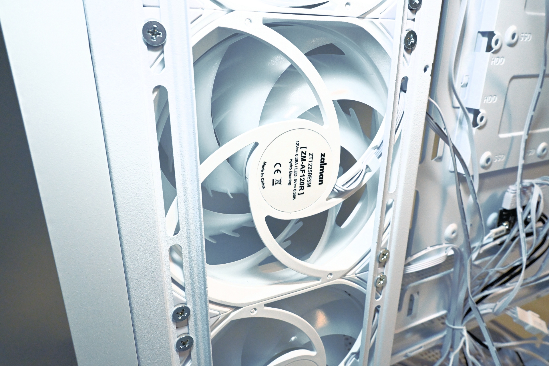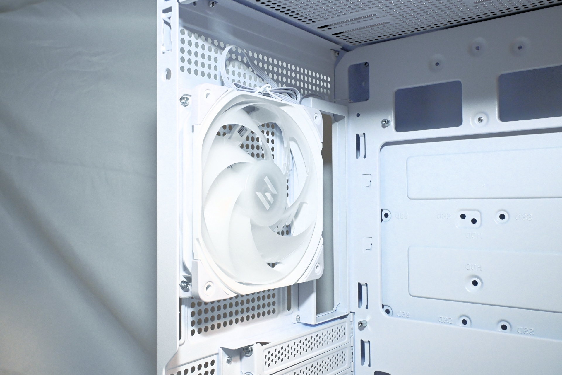 So the inside reveals that we get a total of four included Vibrant AF120 lighting effect fans, all of which are RGB with ARGB capability. The back one is a ZM-AF120 while the three in the front side of the case are reverse models ZM-AF120R. All of the fans feature small spikes on the blades that are there to help the blades cut through air and prevent trembling, this also suppress wind noise by minimizing the vortex phenomenon that occurs on the blades. All fans features hydro bearings. The fans themselves draw up to 0.28A or 280mA of power (3.36 Watt) and if you use the LED lighting features, you can draw up to 0.36A or 360mA more (1.8 Watt). It all depends on the speed of the fans and the brightness of LEDs. Of course, nothing special, but if you're into power saving you might be interested in that.