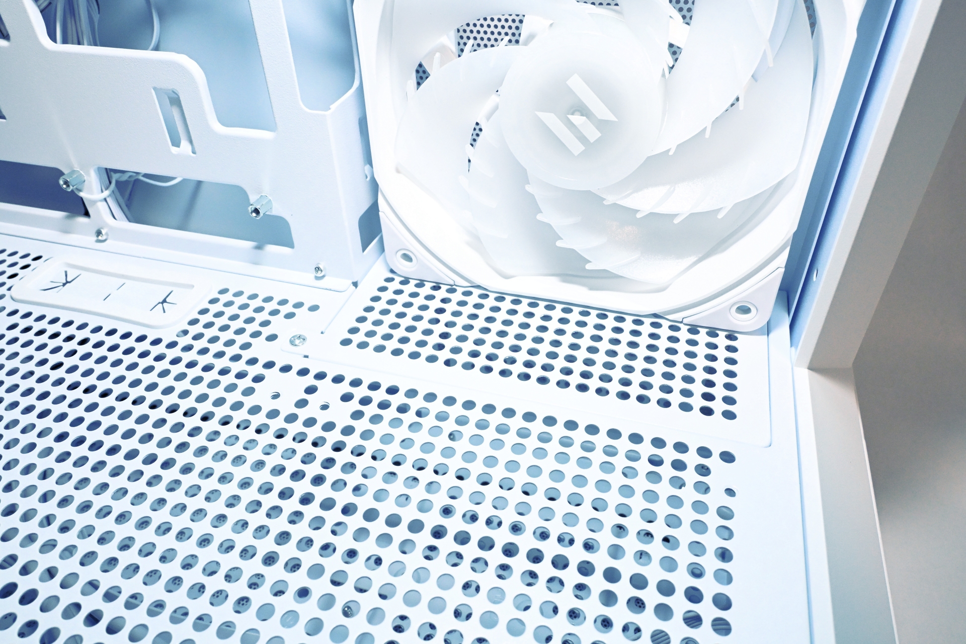 On the inside of the case, in the bottom you can find lots more ventilation holes. Here you have space to mount fans or a watercooling radiator of up to 360mm. Just be sure to direct the fans the correct way so you don't starve your power supply below it if you have a bottom/top mounted fan on the power supply. If the fan on the power supply is mounted in the back, you should have no direct problems. There are some room of course between the perforated metal and the power supply, but it is minimal which normally is no problem at all. In the top of the case also have space for a radiator cooler up to 360mm.