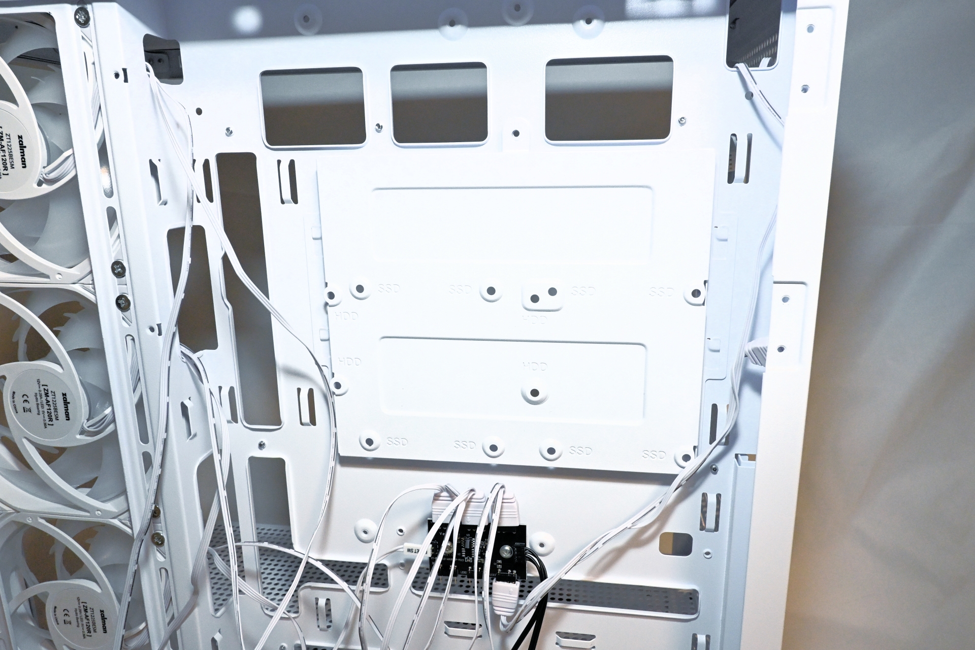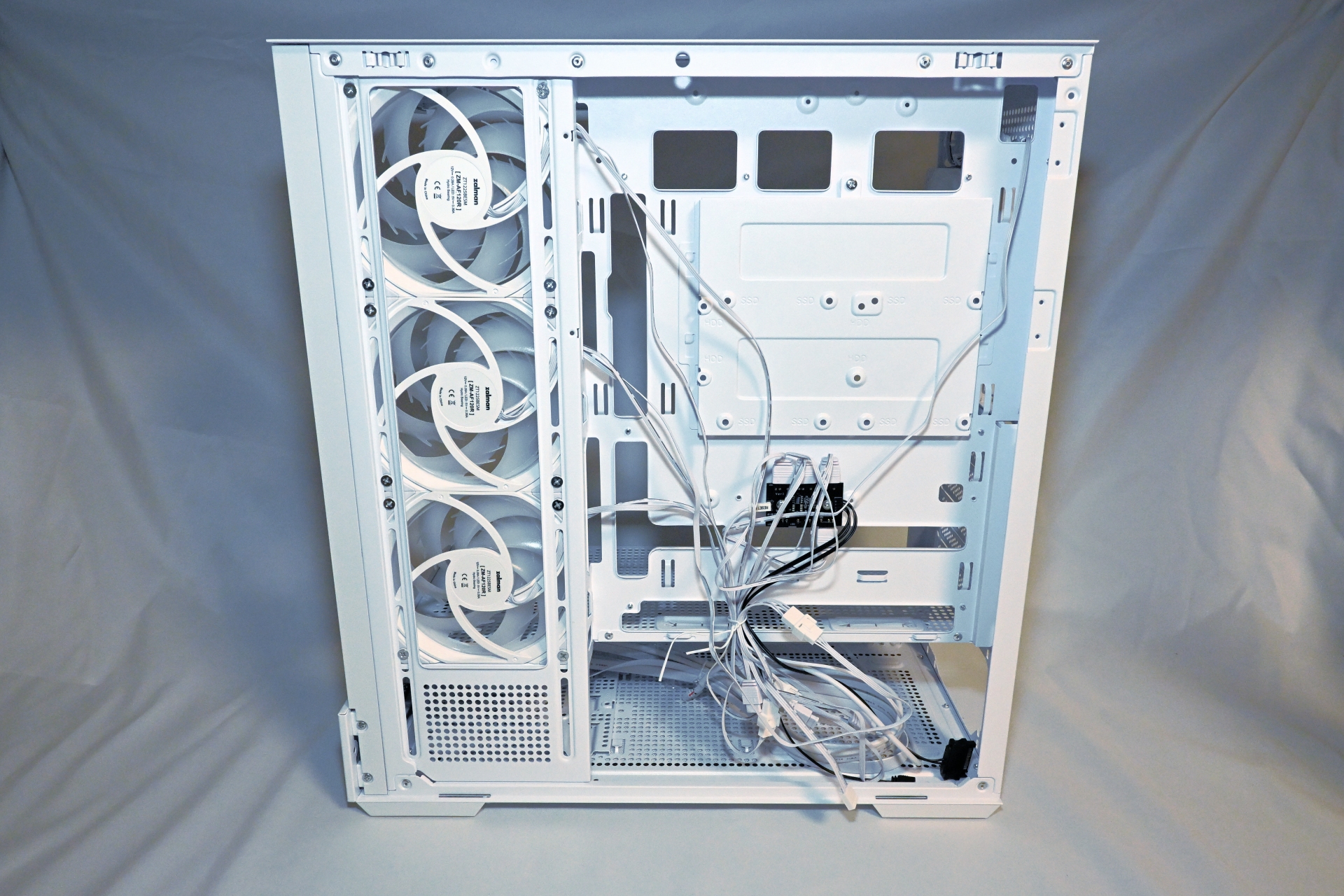 Turning the case around and having a look on the right side of the case reveals the cable routing space, how you install and remove the side case fans as well as place for regular 3.5" disk drives or 2.5" SSD drives. On the back of the motherboard tray you also have space both for mounting 2.5" drives, but you can also remove the metal plate to gain access to the backside of the motherboard. Making a post motherboard installation of water cooling very easy on the motherboard.