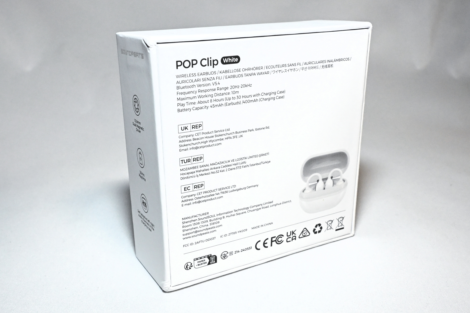 Today we have another pair of earbuds to test, also from Soundpeats and also an open-ear design, namely the POP Clip. Just like the previous earbuds from Soundpeats, also the POP Clip comes in a stylish box with some specifications on the back of the box. Bluetooth version 5.4 here also with a frequency range of 20Hz to 20kHz. Maximum working distance is the normal 10 meters for Bluetooth.
