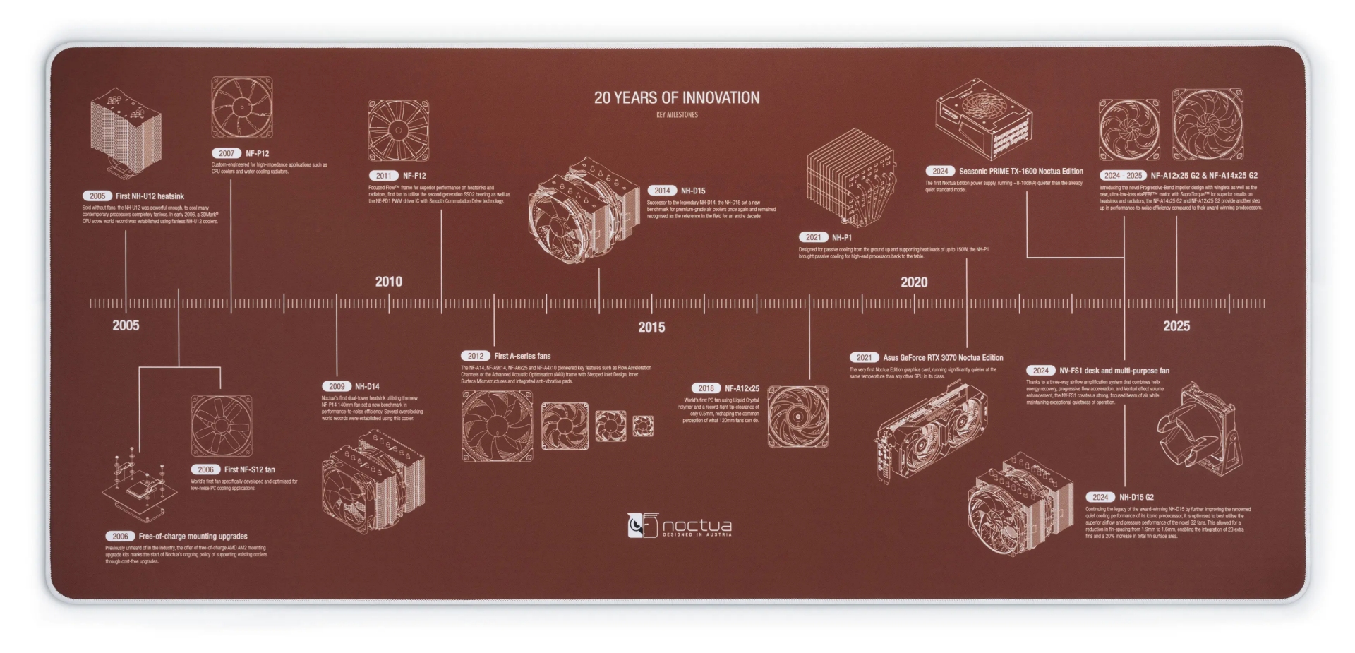 To celebrate its 20-year anniversary, Noctua is introducing the Np-DM3, a premium-grade desk mat with a distinctive timeline design that commemorates key milestones in the brand's history of innovation. The theme spans from the very first Noctua heatsink and fan all the way to the latest G2 series models. It also highlights some of the Austrian' brands most iconic models along the way, such as the Nf-P12, Nf-F12 or Nh-D14; and it's guaranteed to bring back fond memories of your favourite Noctua products.