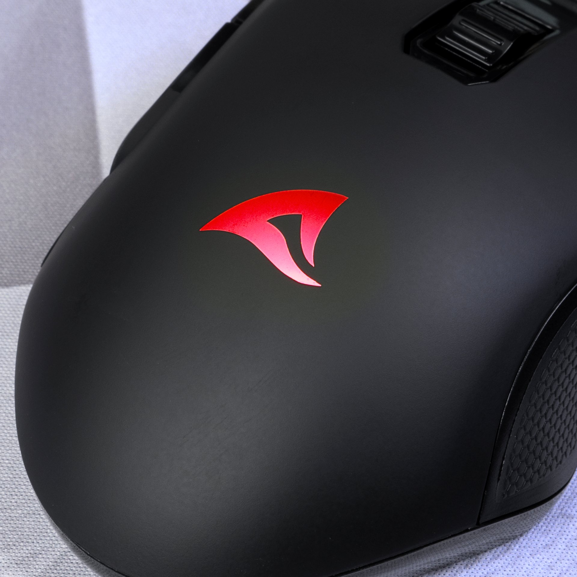 The RGB-illuminated logo on the top of the Skiller SGM30W not only provides colorful highlights, but it also serves as an indicator for the battery status.