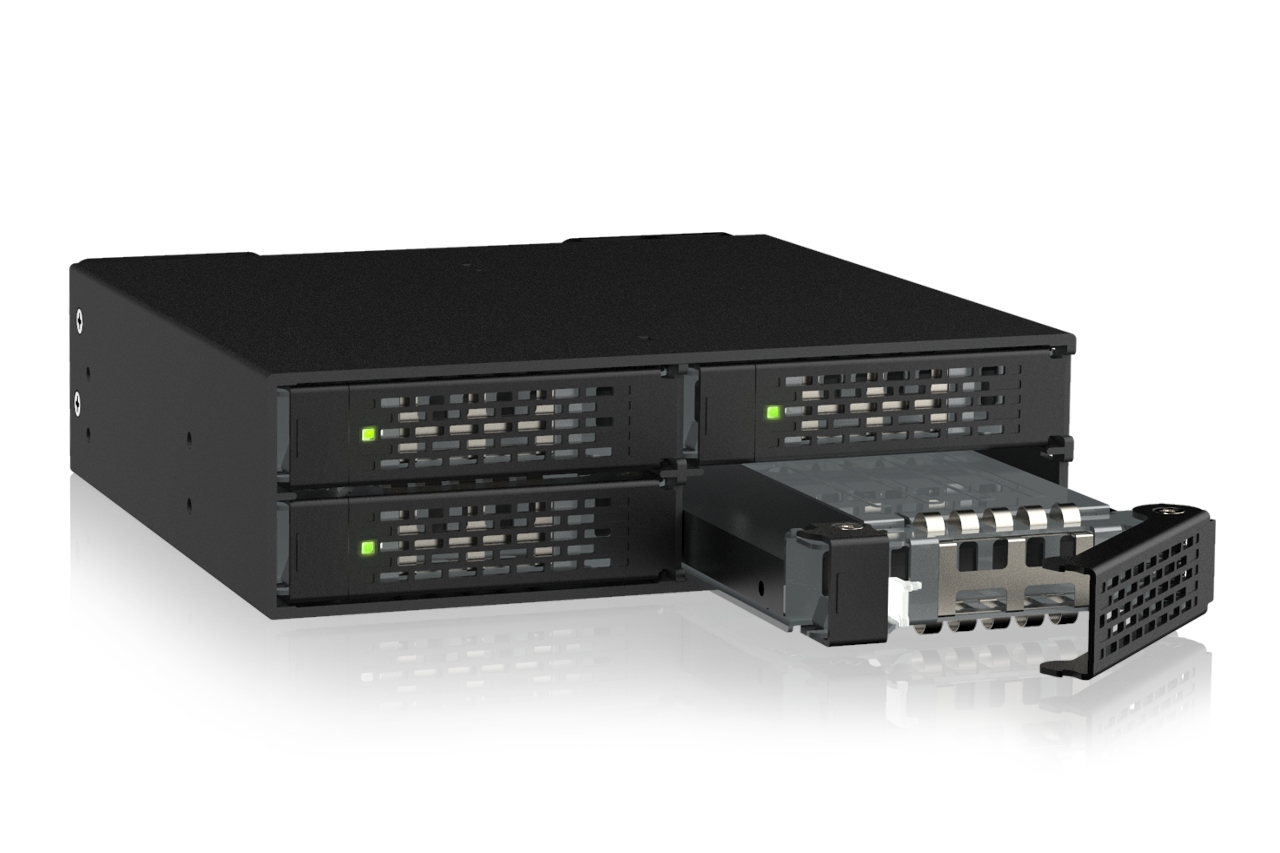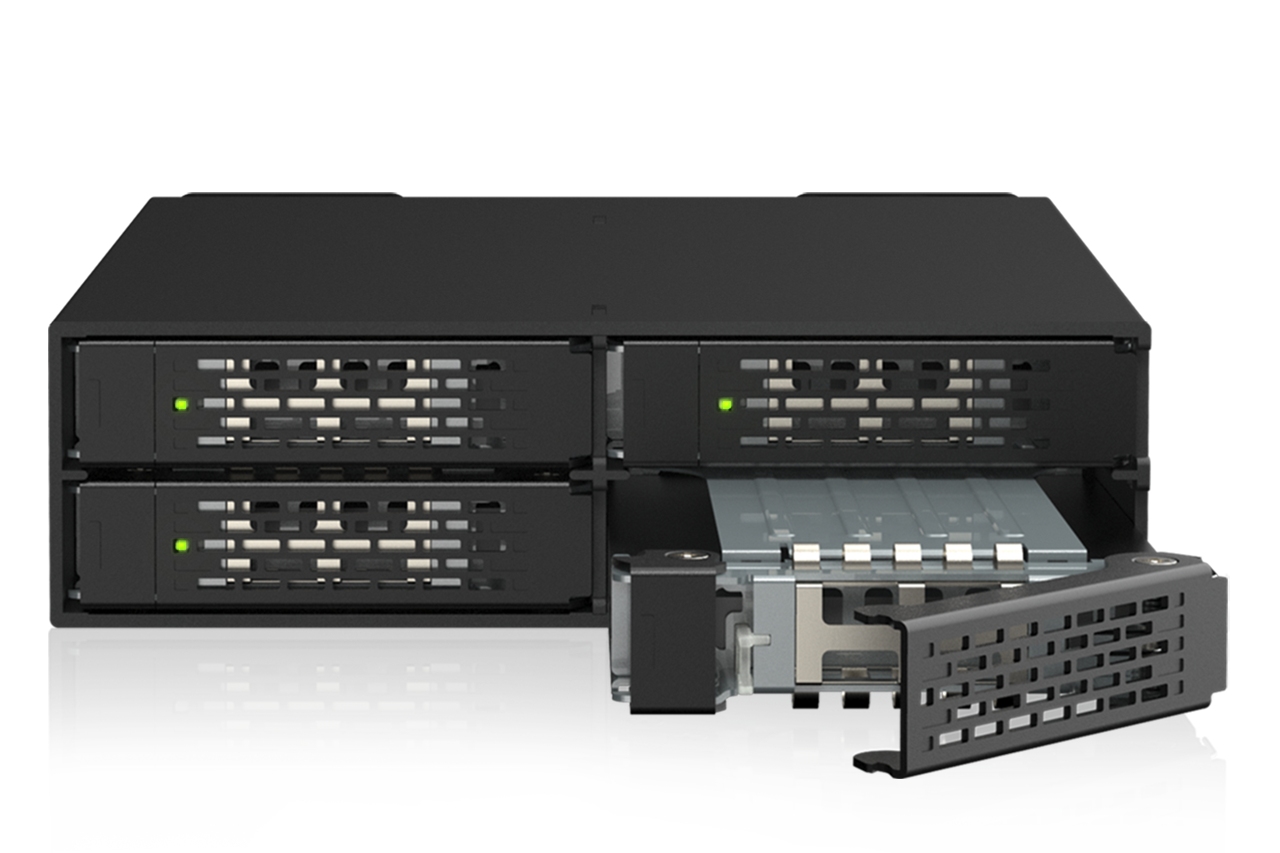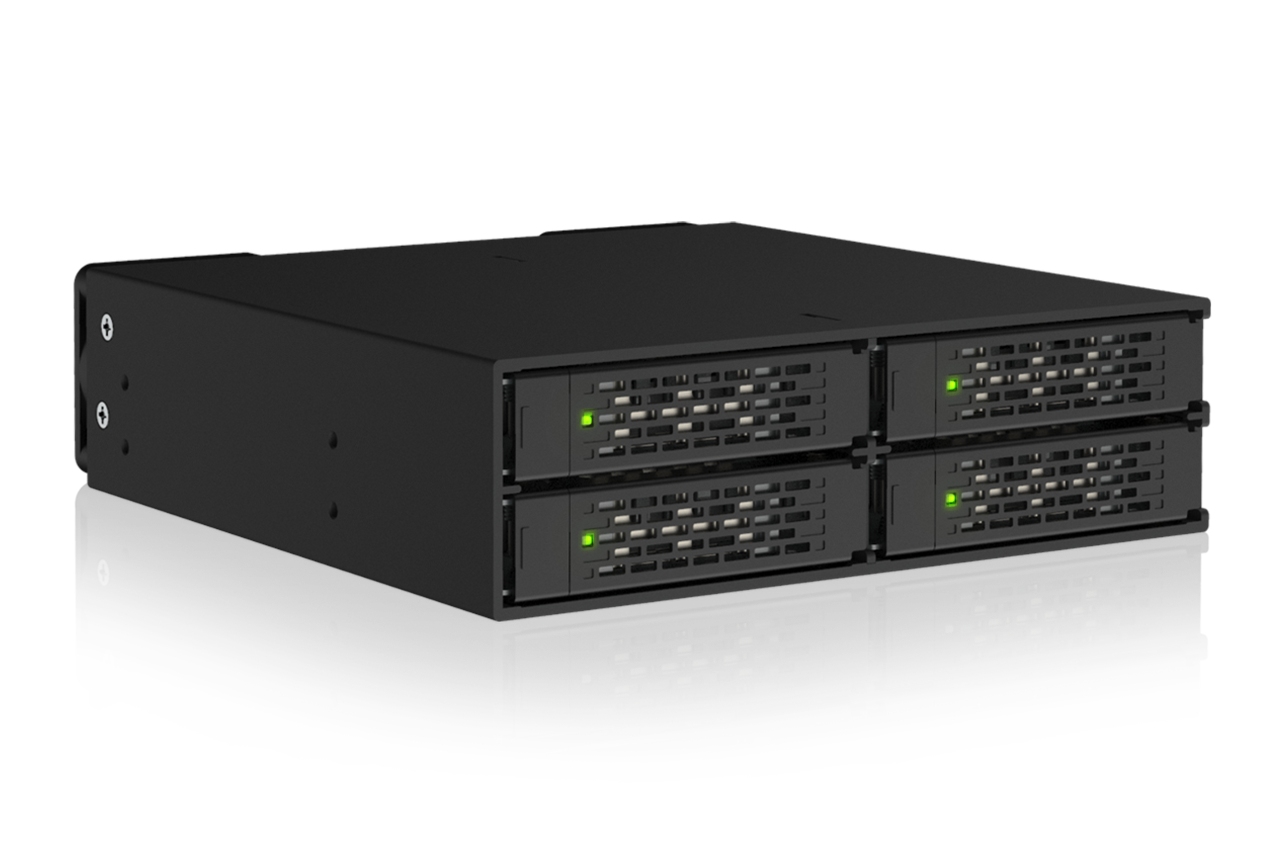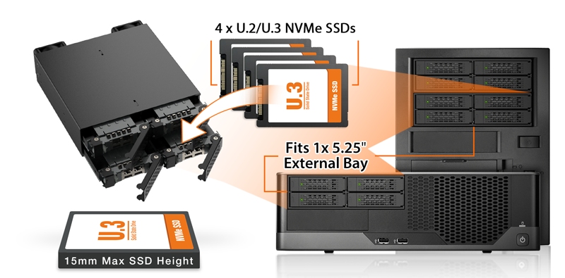 • Fits 4× U.2/U.3 NVMe SSDs (5-15mm) into a single external 5.25" bay