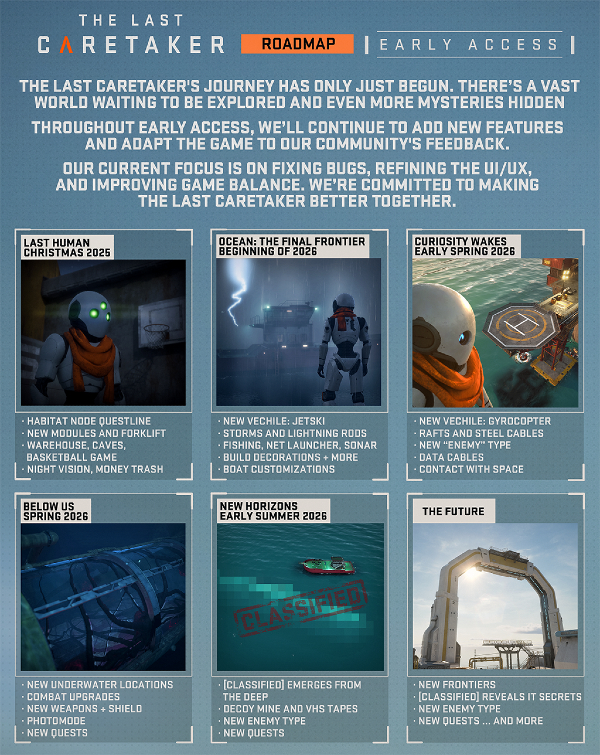 The team is so thankful for everyone that has joined us on the voyage so far but the mission has just begun. The Last Caretaker's Early Access period will feature regular content updates already planned, including new vehicles, essential new items to build, world expansion, lore and story. Check out the content roadmap below.