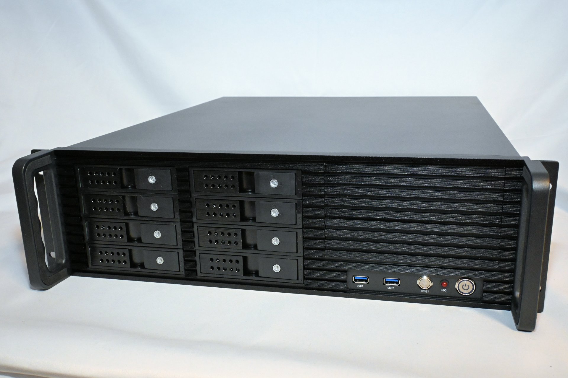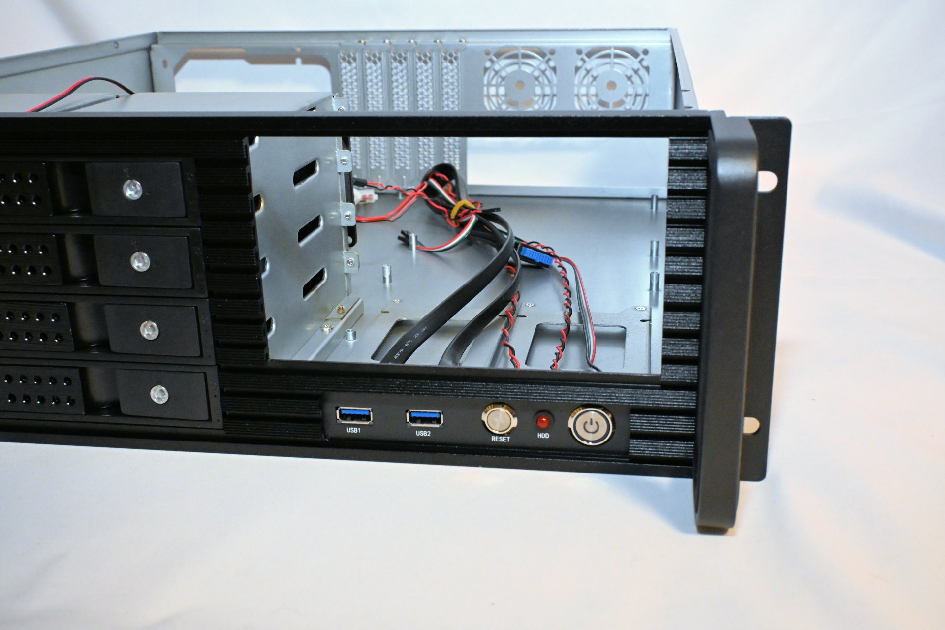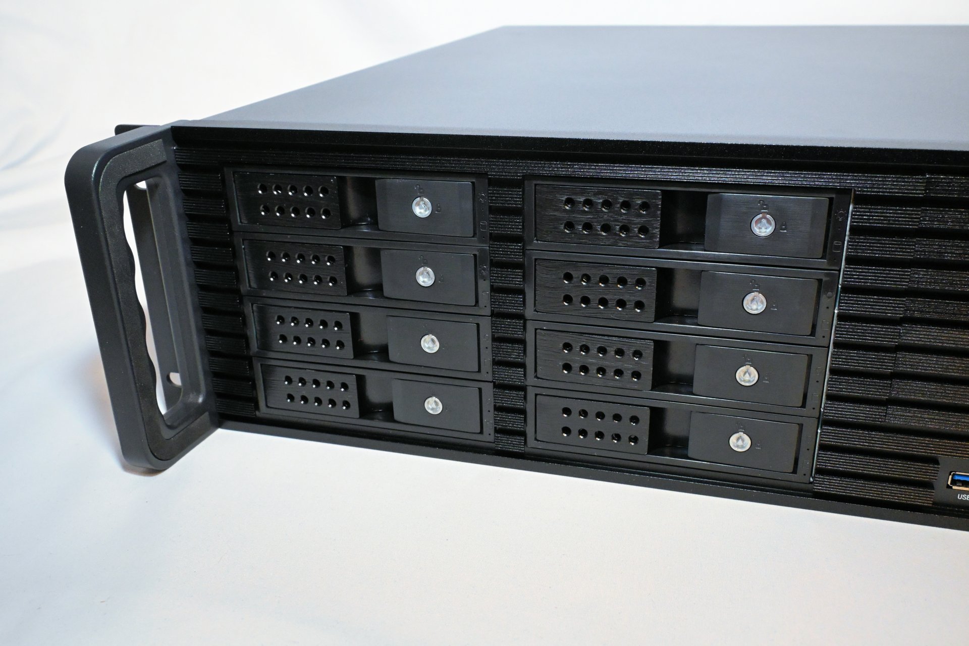 The front handles are made from high-quality, rigid steel with foam inlays for improved grip and comfort - a detail not commonly seen in rackmount chassis. The rack ears come pre-installed from the factory, saving an extra step during assembly. Combined with the front USB ports, power and reset buttons, and hot-swap bays, this is a complete chassis designed with home and small-business server builders in mind. It has everything you need for a reliable, consumer-hardware-based server.