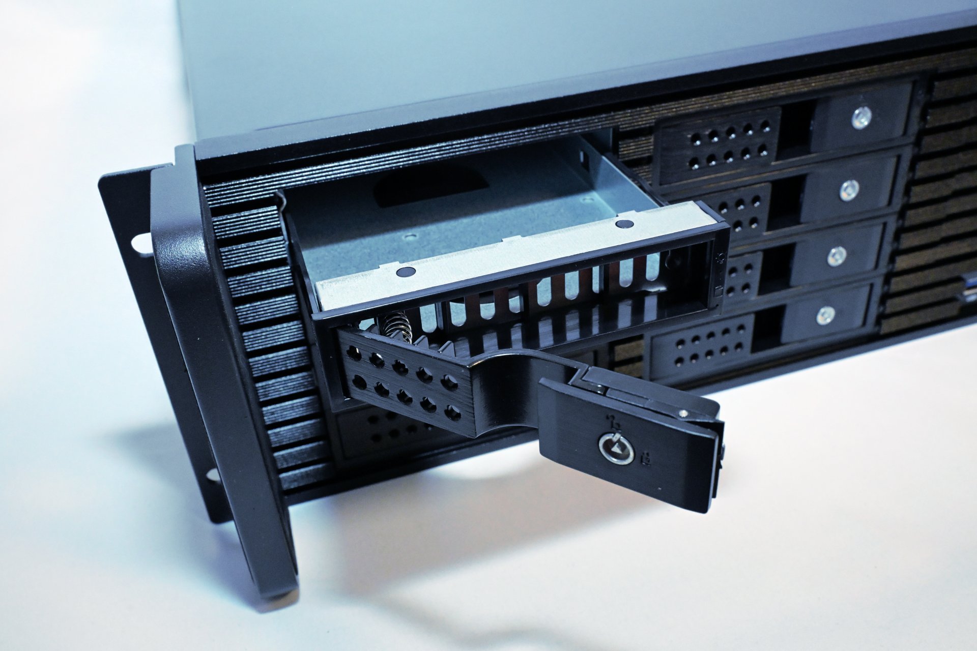 The drive caddies are easy to remove and open. Mounting a drive is done via screws on the sides, and once reinserted, the caddy clicks firmly into the backplane for a solid connection.
