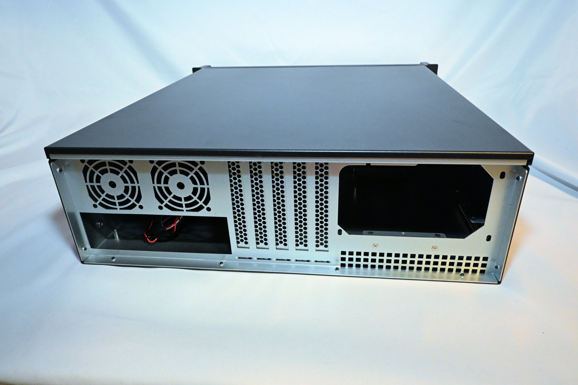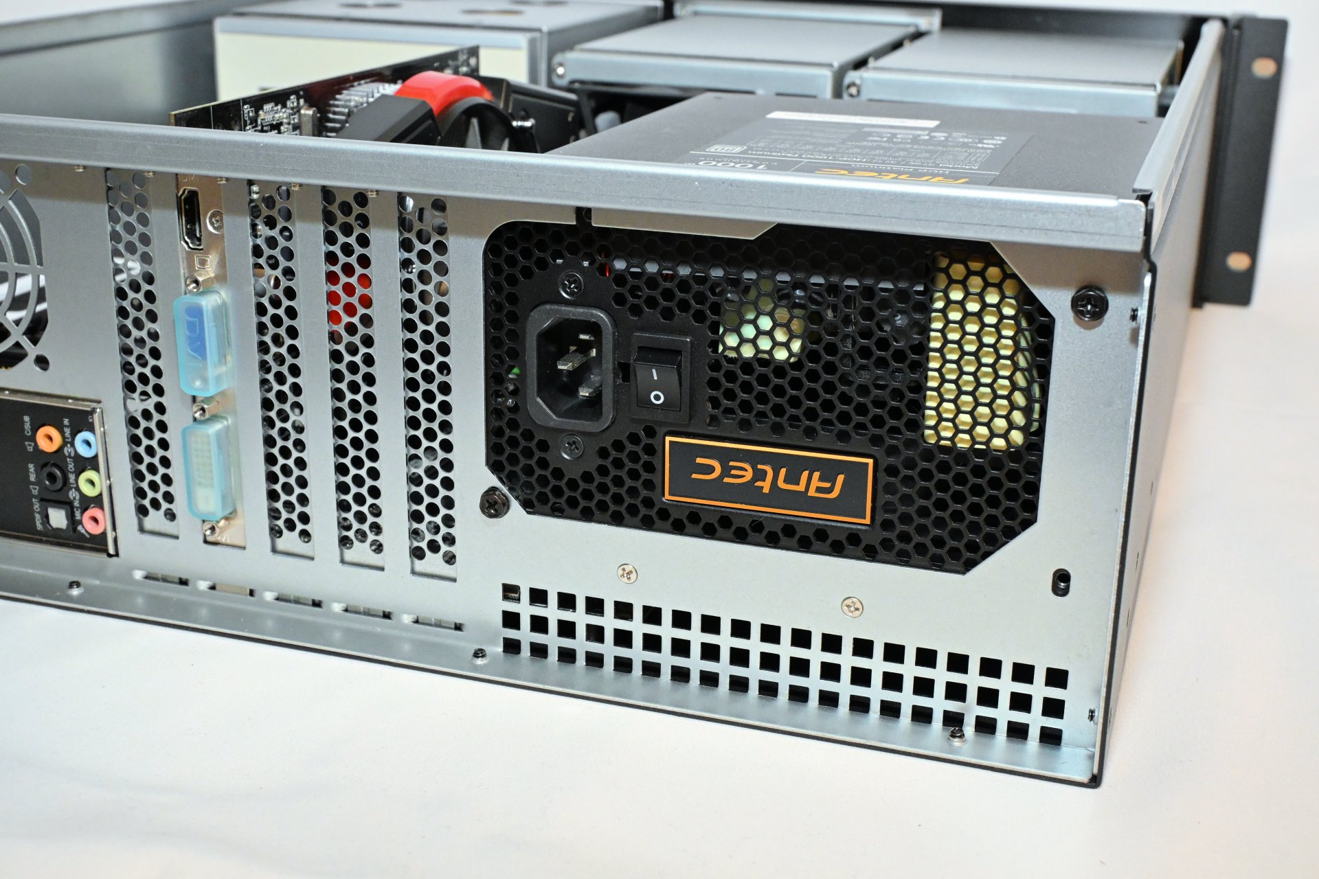 The power supply must be installed upside down in this case, and Inter-Tech has provided ventilation holes beneath it to support this orientation. The downside is that the PSU may draw in warm air from its own exhaust path. In theory, warm air should rise quickly enough to avoid being pulled back in, but realistically it may be worth covering the holes so the PSU draws air from inside the chassis instead of from the "hot aisle" behind the rack. Either way, the flexibility is appreciated - leave the holes open if you prefer external intake, cover them if you want internal intake.