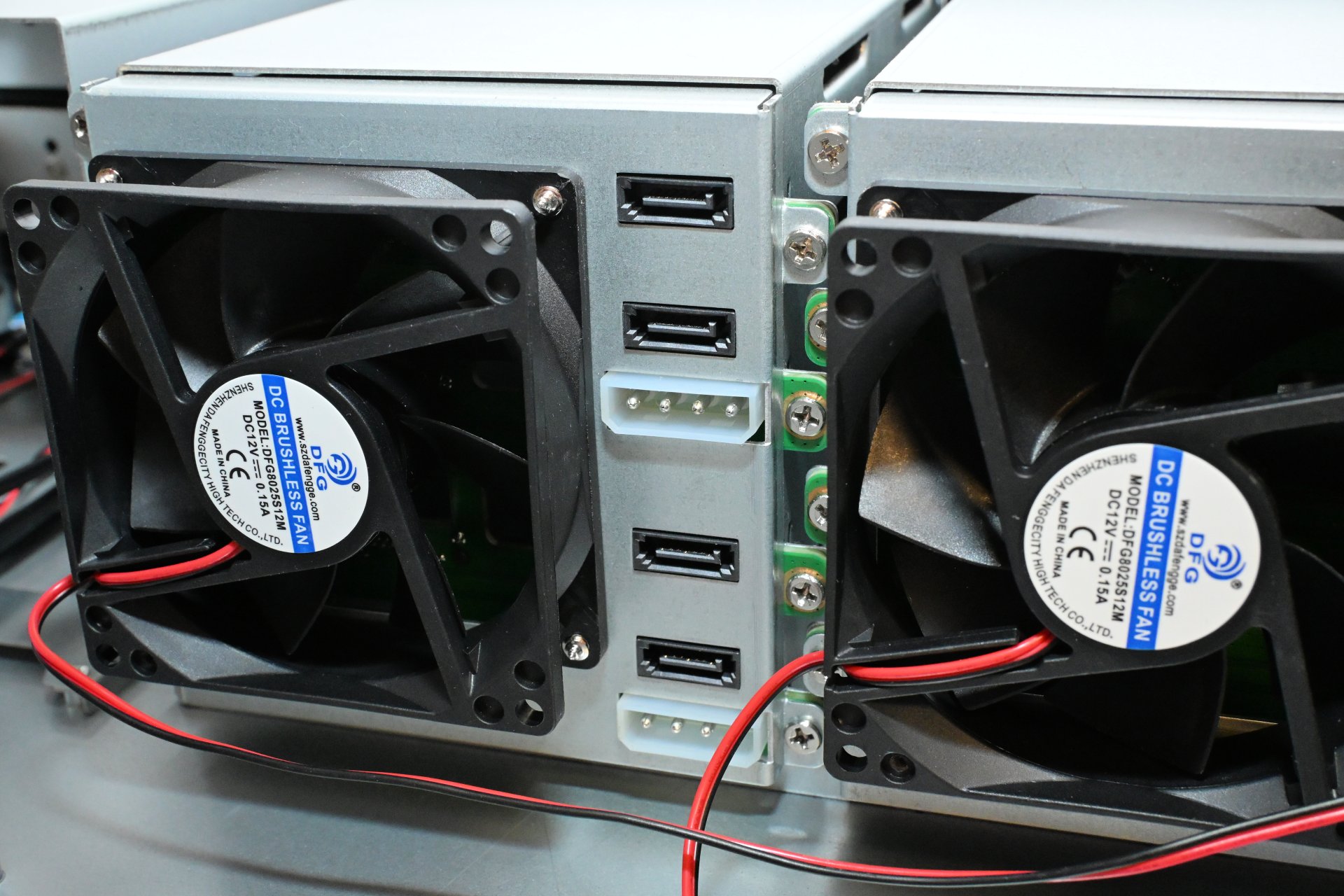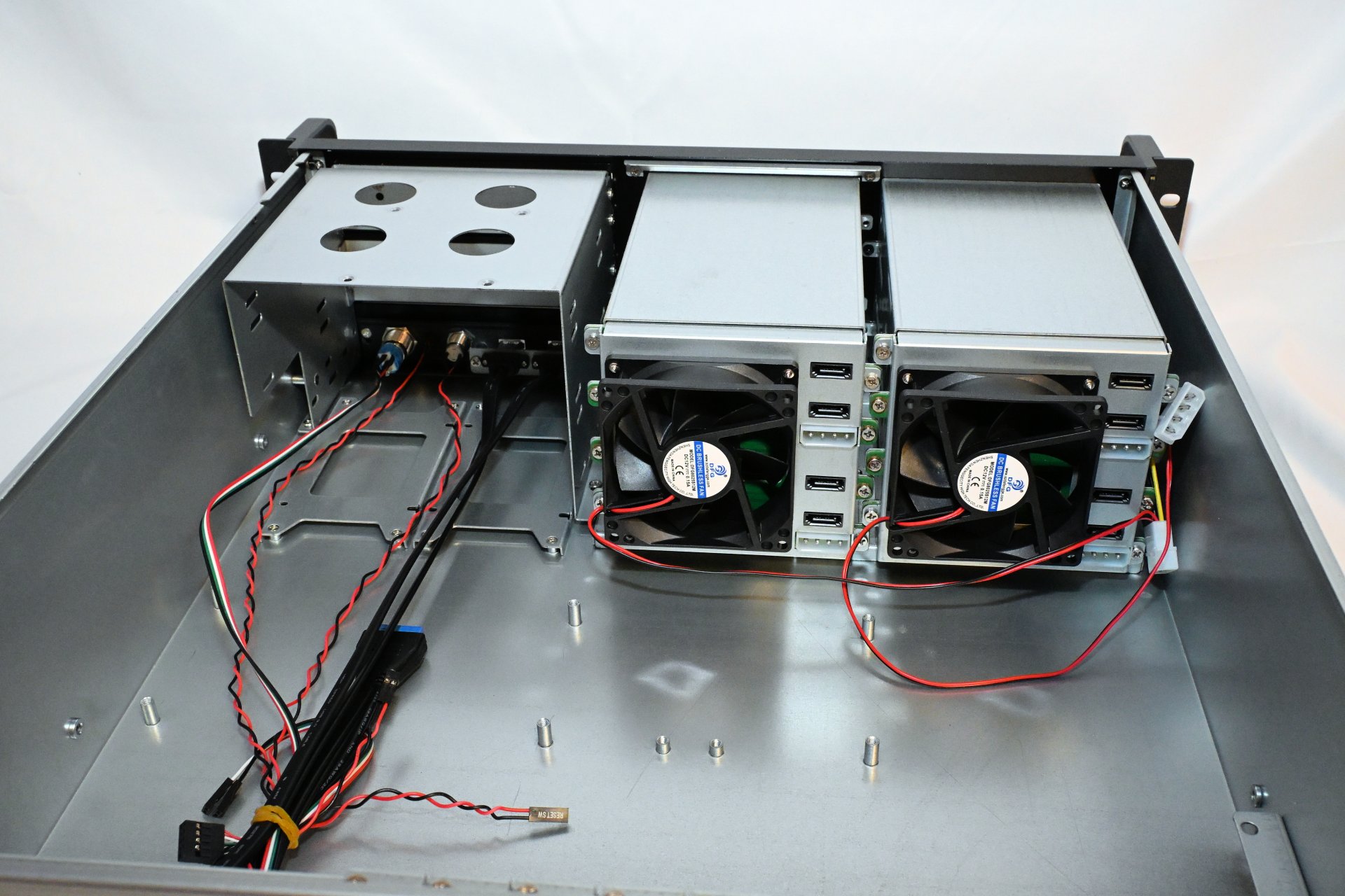 Opening the case requires removing four screws - two on each side of the top cover - and sliding the lid backward. Inside, at the front, we see the two hot-swap modules, each equipped with an 80 mm fan, four SATA ports, and two Molex power connectors.