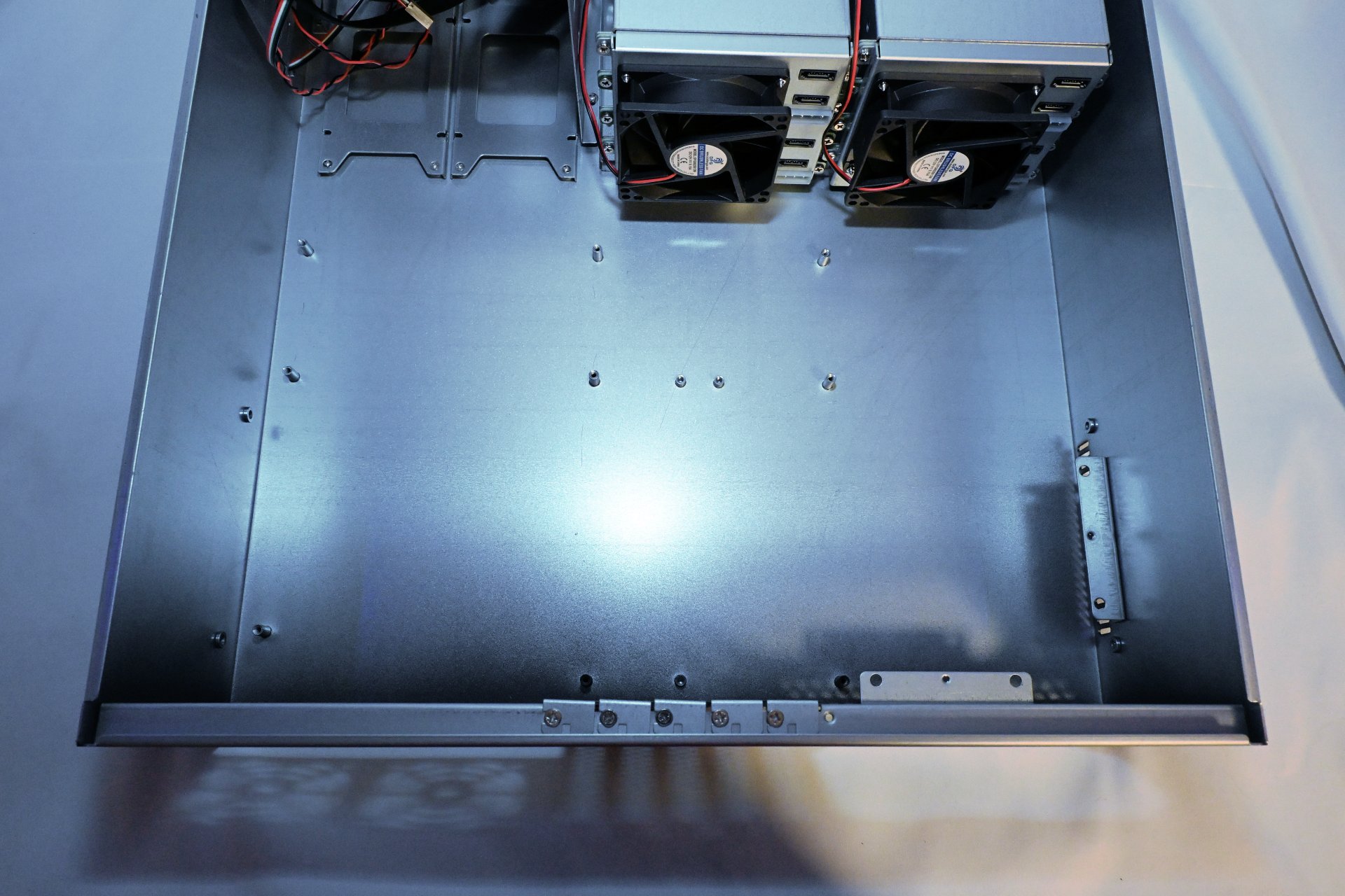 Viewing the interior from above reveals little else beyond the motherboard standoffs, leaving a clean and unobstructed layout.
