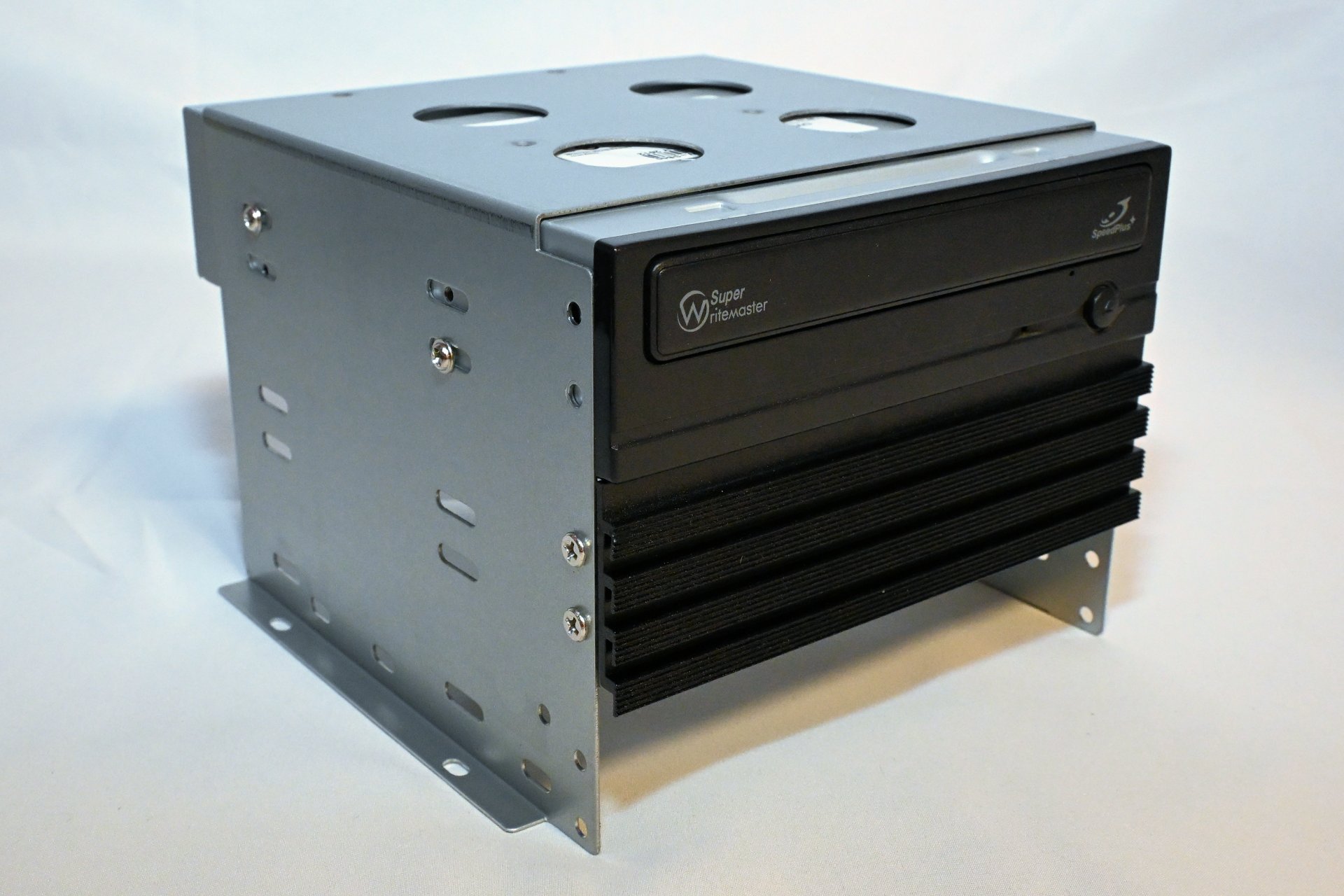 Removing the 5.25" cage allows straightforward installation of drives or accessories. In my test build, I installed a black Dvd writer, which visually matches the chassis nicely. Reinstalling the cage posed no issues.