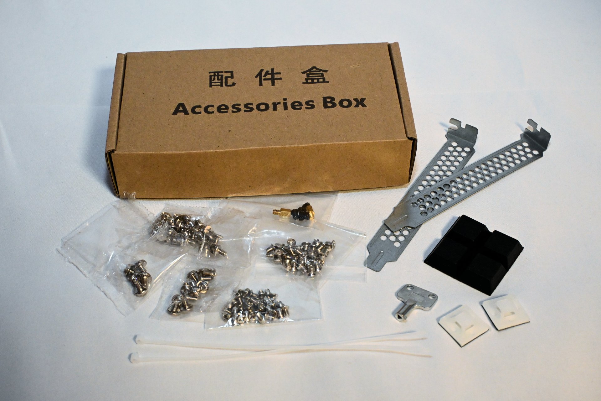 Inside the accessories box we find all the screws needed for the build, spare expansion slot covers, zip ties, adhesive anchors, a key for the drive bay locks, and four rubber feet in case you want to use the chassis as a standalone desktop/server instead of rack mounting it.