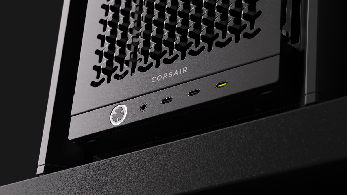 The updated front I/O features triple USB Type-C ports, the right-most supporting connections up to 20Gb/s.