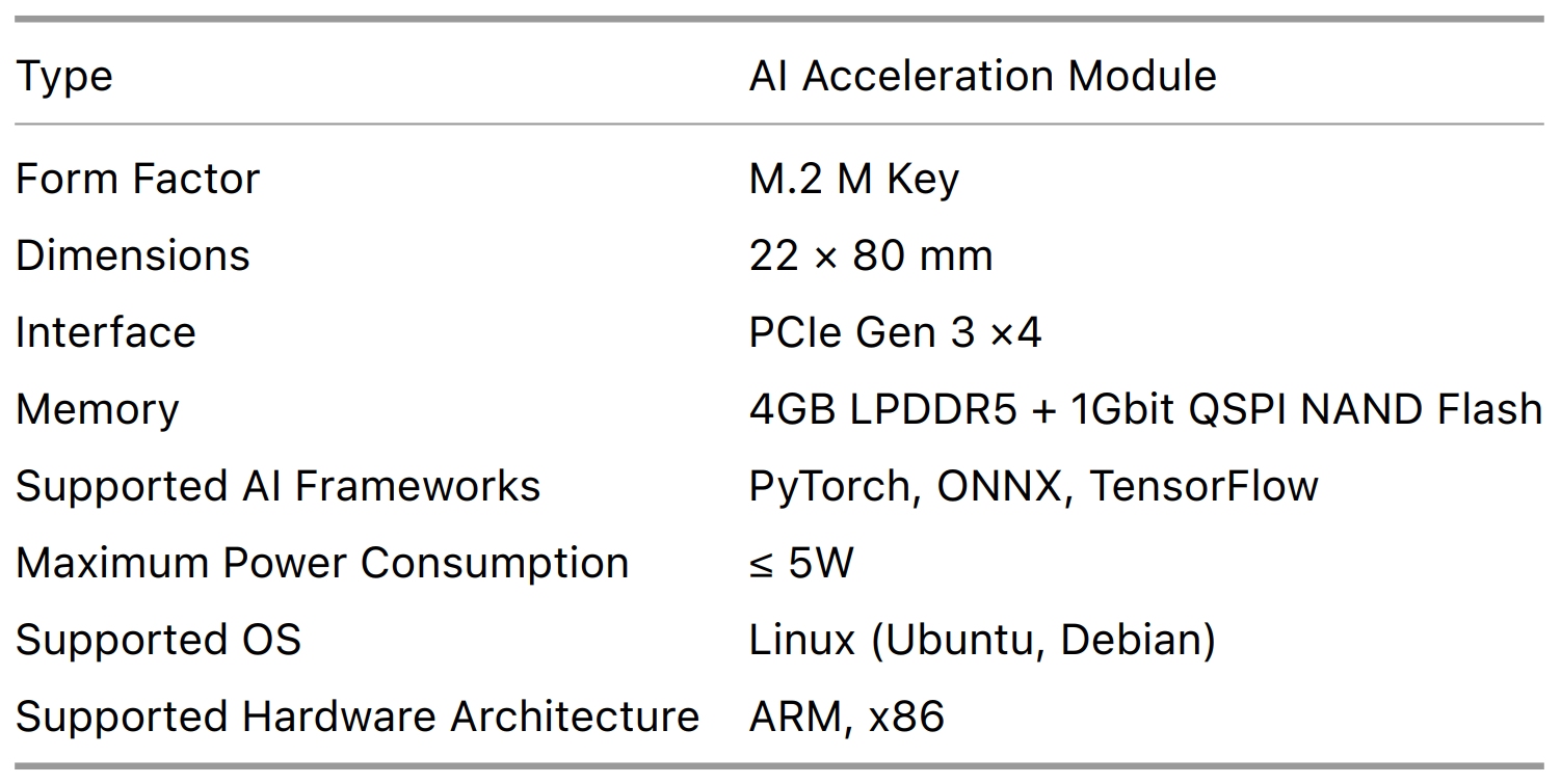 Features an energy-efficient design with excellent inference performance and low power consumption, achieving 25 Tops computing power with only 3-5W power consumption.