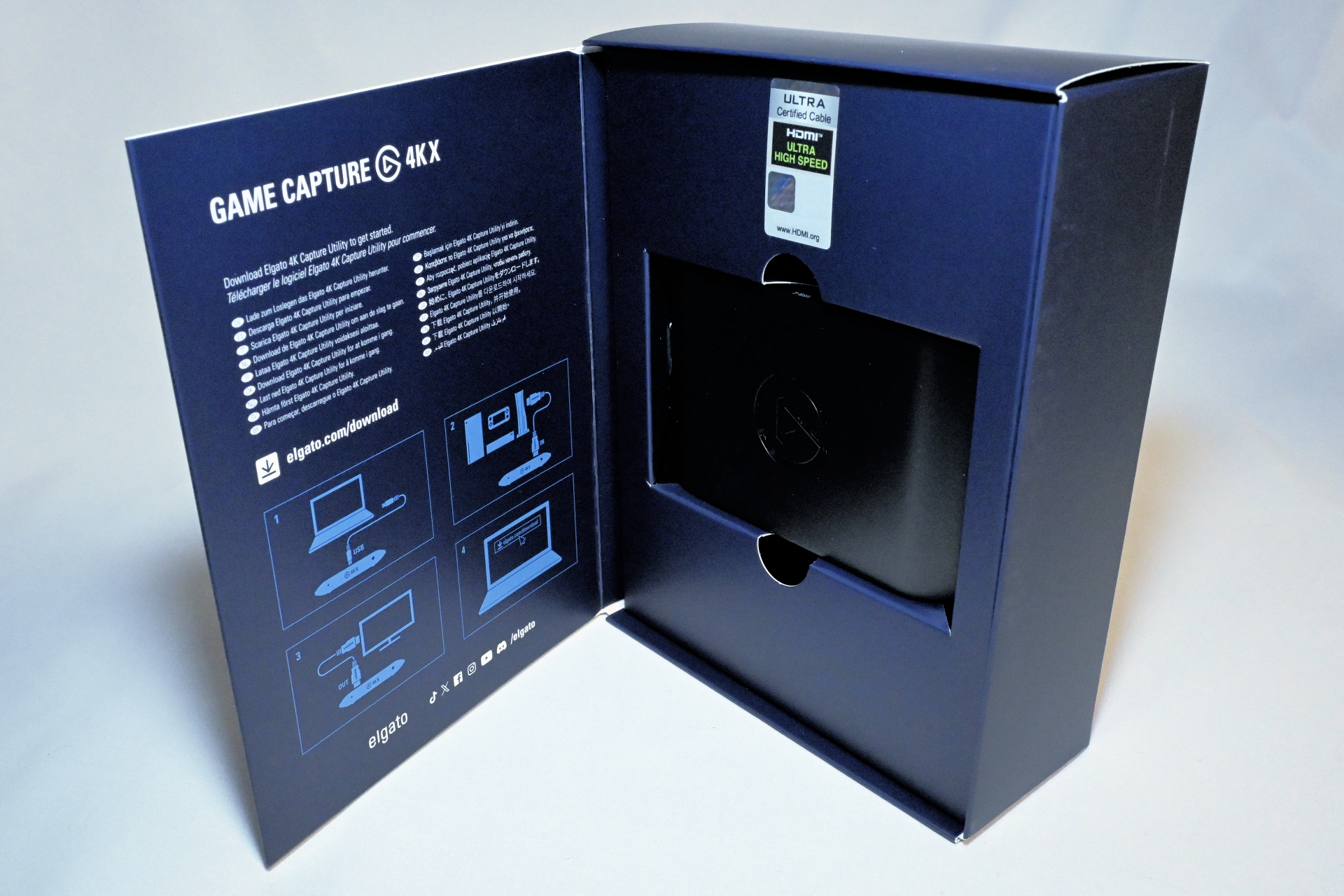 Opening up the box reveals another box which holds the actual 4K X capture device as well as some basic how to information. We also get to know that there is a capture utility that we can download from the Elgato website. We can also see that the included HDMI cable are certified for ultra high speed. I honestly think this is the first time I've ever seen a certified cable bundled together with any product. It is nice to see and it should hopefully mean that the HDMI cable are of great quality and hopefully will last longer than "normal" HDMI cables.
